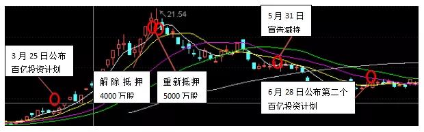 在美锦能源3月底公布第一份百亿投资计划之后,股价从7.33元迅速飙升到20元左右,而此时美锦能源于4月23日将4000万股股票解压(质押时市值20597.52万元)之后,又于4月24日将5000万股股票质押(市值91450万元)。