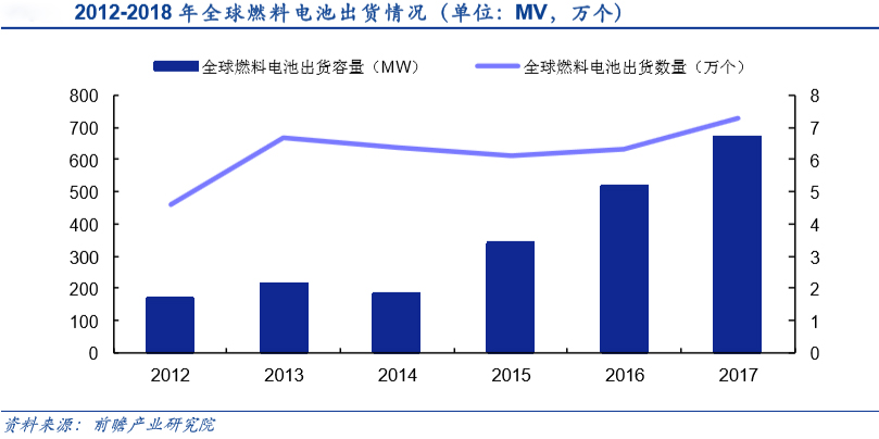 近年来,全球燃料电池市场正进入快速增长期。2012-2017年,全球燃料电池累计出货数量37.3万个,出货容量2511MW,年复合增速分别达10%和32%。保守估计2018年全球燃料电池出货容量已突破800MW。