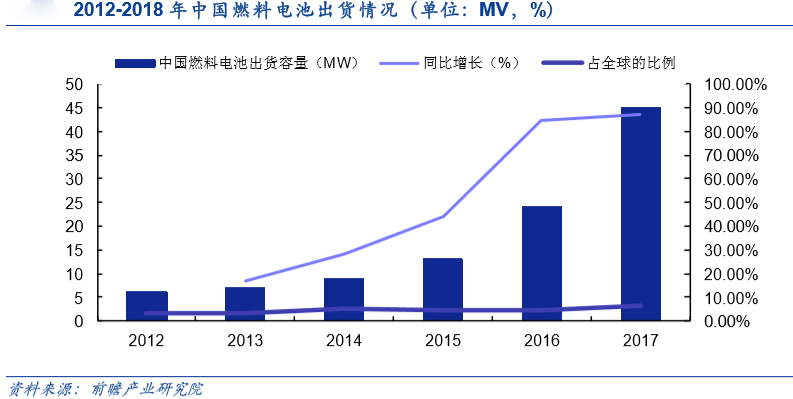 截至2017年底,我国燃料电池行业整体产能在60MW以上,2017年燃料电池出货量达到45MW,出货量增速进一步提高。