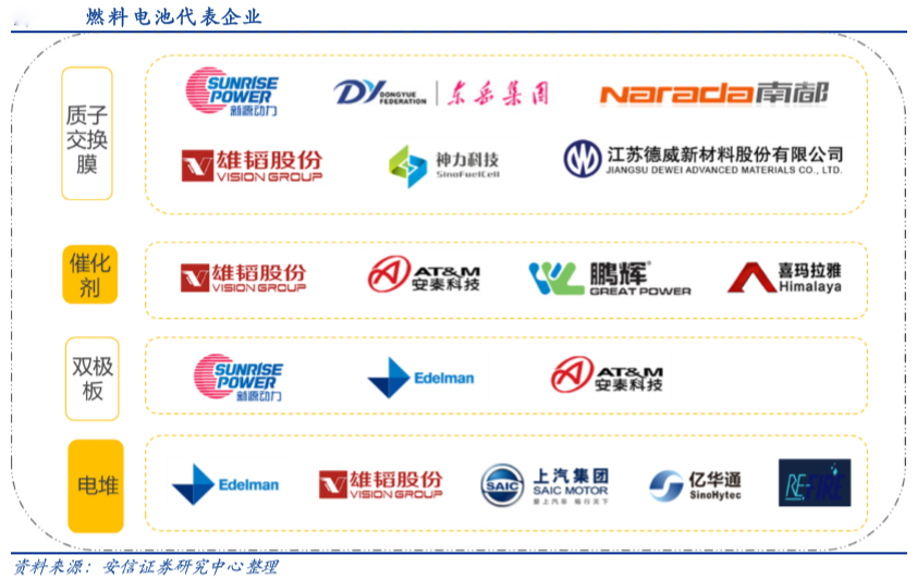 代表企业包括:新源动力、雄韬股份、神力科技、德威新材料、安泰科技、潍柴动力等等。