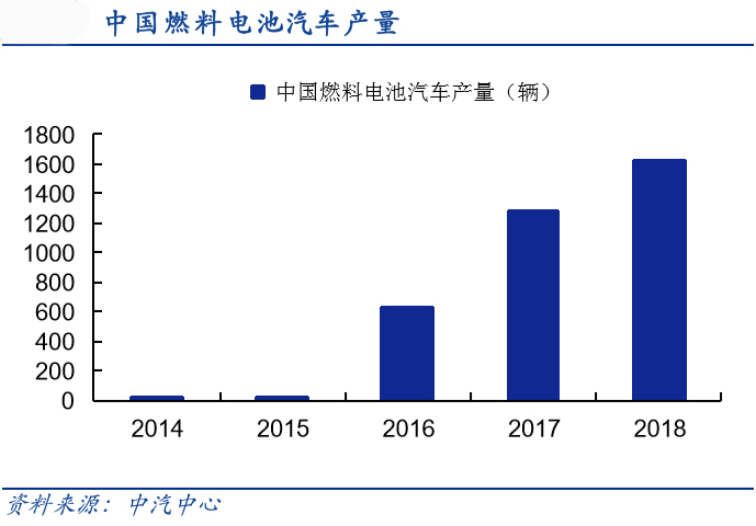 近年受益政策支持,中国燃料电池汽车产量呈“J”型增长,2017全国燃料电池汽车产量达到1272辆,2018年是燃料电池汽车商业化运营的元年,产量跃升至1619辆,燃料电池汽车产业开启以补贴为基石的内生性增长时代。