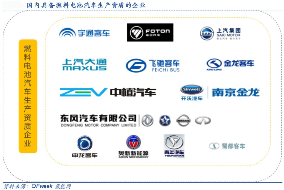目前国内具备燃料电池汽车生产资质的企业有13家:宇通客车、福田汽车、上汽集团、上汽大通、申龙客车、中植汽车、金龙客车、东风、飞驰客车、奥新、南京金龙、青年汽车、蜀都客车。