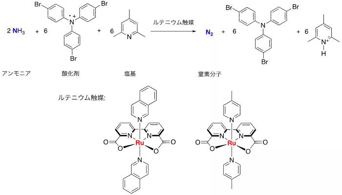 在本研究组中,在被称为水氧化催化剂的钌络合物的存在下,使用三(4-溴苯基)铵基六氯锑酸作为氧化剂,2,4,6-可力丁作为碱,三氟甲磺酸铵作为氨源,在温和条件下进行催化氨氧化反应,发现产生了氮分子。