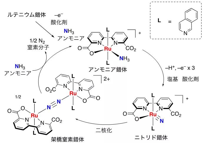 这次课题是由东京大学工学研究院的西林仁昭教授和東邦大学的坂田健教授等人的研究小组主导,通过在钌催化剂中结合了氧化剂和碱的反应系,成功开发出了氨的催化氧化反应。(图2)