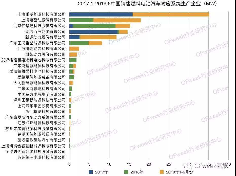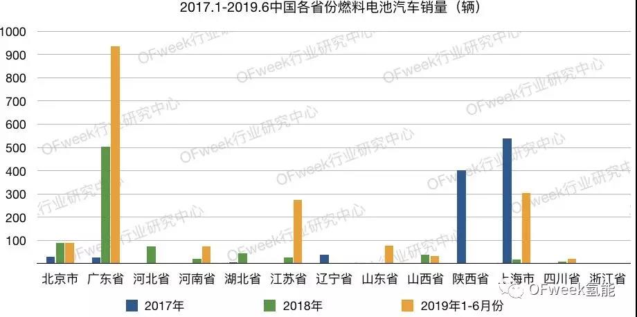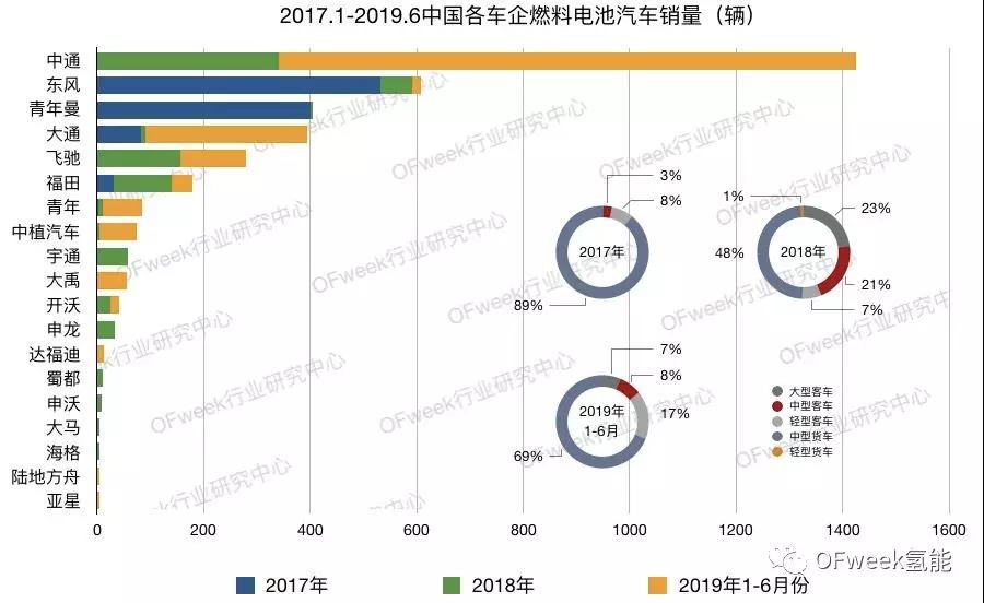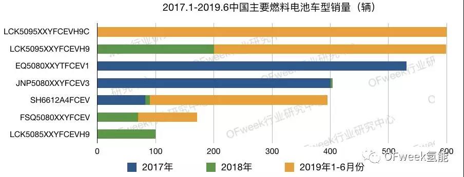 根据OFweek行业研究中心统计数据显示,我国2017年-2019年6月份销售的燃料电池共计3689辆,包含了19家汽车企业的53款车型。