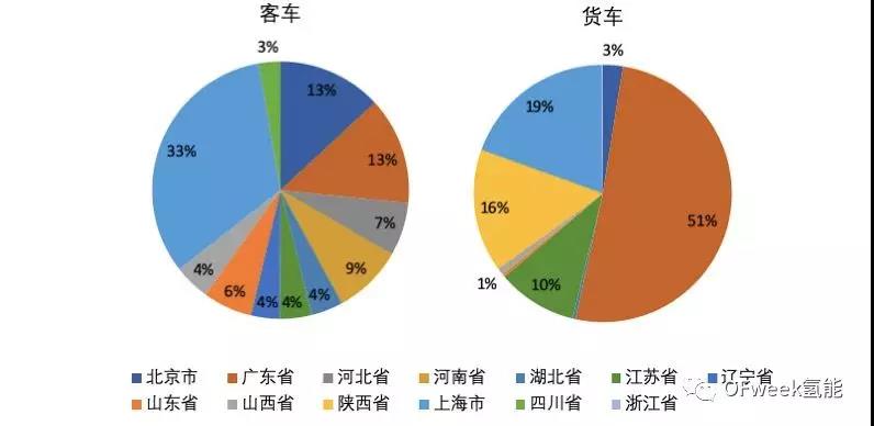 反应在数据上来看,我国2017年-2019年6月份销售的燃料电池货车市场集中度比客车更高,其中96%分布在了广东省、上海市、陕西省和江苏省四个地区。