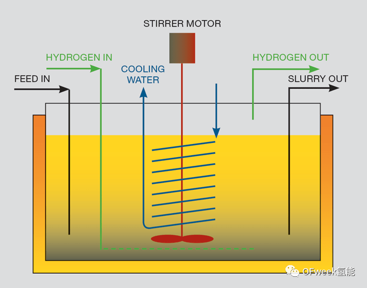饱和油和脂肪的加氢是一个间歇过程,发生在一个加热罐(见图2)中。进料油(如葵花籽或橄榄油)被泵入加热的压力容器,并在加热时保持真空以抑制氧化。将温度升高到140-250℃,搅拌混合物以确保温度均匀。