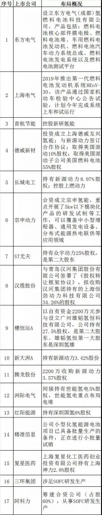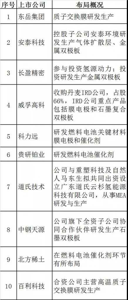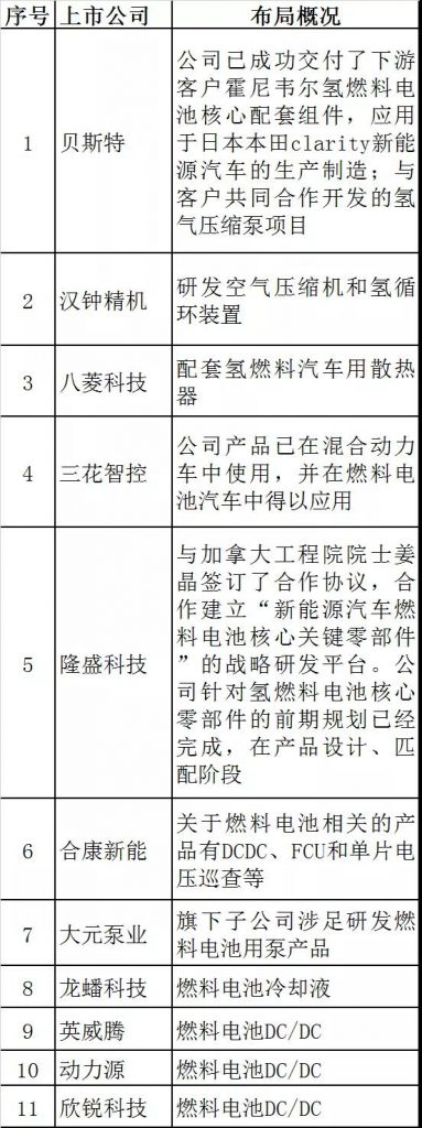 涉足燃料电池整车的上市公司有:康盛股份参股亿华通1.11%股份;收购中植一客;今年1 月 30 日,与成都经济技术开发区管理委员会、成都市龙泉驿区人民政府签订了《加快发展氢能产业的合作协议》;