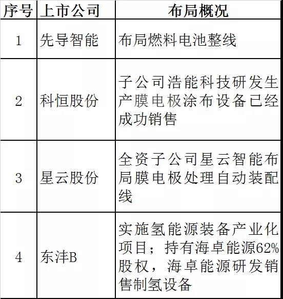 布局电堆及系统的上市公司分为两类:一类是通过设立子公司、兼并购等方式,占据燃料电池企业较大股权的企业,有东方 电气、上海电气、首航节能、德威新材、长城电工、宗申动力、ST尤夫、汉缆股份、穗恒运A等;一类是投入偏小或者业务偏小的企业,比如新大洲A、腾龙股份、洲际电气、红阳能源、精准信息、复星医药、三环集团、阿科力等。