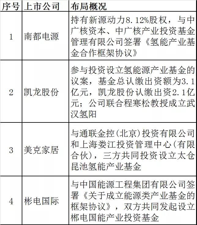 美锦能源和雄韬股份实现从制氢到整车的全产业链布局;大洋电机、雪人股份及潍柴动力围绕燃料电池系统及关键零部件布局,其中潍柴集团涵盖燃料电池整车。