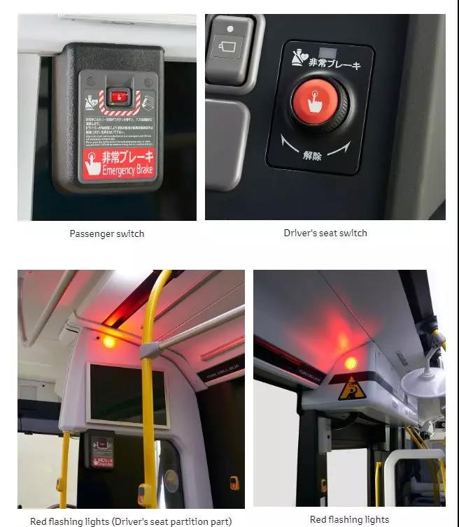 当公交车开始减速时,红灯闪烁,并有语音提示乘客有紧急情况;车辆外部和附近的人通过喇叭、闪烁的停车灯和危险灯来警报。