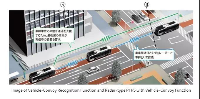 该系统利用车对车的通信和毫米波雷达,在任何给定路段的最大公交车次范围内识别公交车上的信息、公交车的顺序和车队之间的距离信息,并通知司机车队的规模。