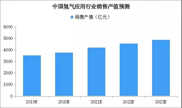 氢能应用行业销售产值同样呈现增长趋势。据预测,2019-2023年我国氢能应用行业销售产值逐年增长,2019年将超3500亿元,到2023年将近5000亿元。